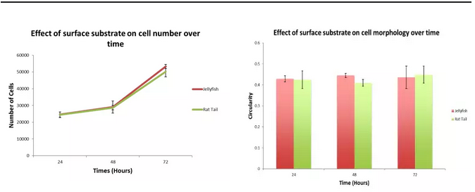 細胞培養72h結果顯示,在水母膠原(紅)上生長的細胞與在大鼠尾膠原(綠)上生長的細胞,細胞增殖水平和細胞形態接近。Jellagen是哺乳動物膠原蛋白良好的替代物。