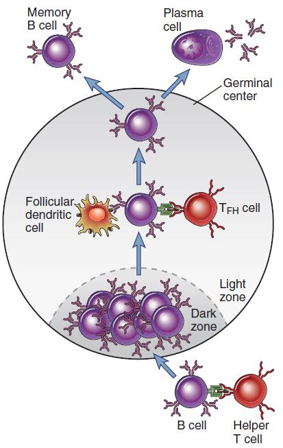 Tfh 細(xì)胞的主要作用是增加高親和力 B 細(xì)胞和長壽漿細(xì)胞的形成,并幫助他們轉(zhuǎn)移到發(fā)生中心(GC)。在接受抗原刺激后,初始 B 細(xì)胞首次移動(dòng)到 T 細(xì)胞區(qū),且在來自 Tfh 細(xì)胞和抗原呈遞細(xì)胞的共刺激作用下開始活化并形成發(fā)生中心。當(dāng)發(fā)生中心的 B 細(xì)胞開始分化為漿細(xì)胞或記憶 B 細(xì)胞時(shí), Bcl-6 會阻止 B 細(xì)胞的增殖,因?yàn)?Bcl-6 可以抑制 B 細(xì)胞活化基因的表達(dá),如 CD69、 STAT1 和 CD80 等,同時(shí)也會通過調(diào)節(jié) Prdm1 來抑制發(fā)生中心的 B 細(xì)胞向漿細(xì)胞分化。 Tfh 細(xì)胞通過 CD40 的作用致使 Bcl-6 轉(zhuǎn)錄沉默,從而促使發(fā)生中心 B 細(xì)胞存活和增殖。且在這一過程中,CD40L、PD-1、BAFF、IL-4 和 IL-21 等信號分子的參與也是必不可缺的。