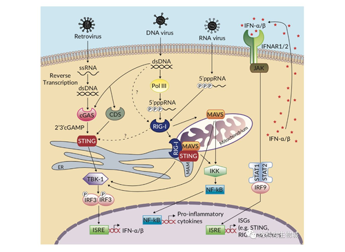 感受器cGAS和RIG-I通過單獨的接頭蛋白來識別不同的核酸和信號。cGAS感受細胞質中異常DNA的存在和濃度,而后通過環(huán)二核苷酸2’3’-cGAMP[2]募集干擾素基因刺激因子(STING, or MITA/ERIS/MPYS)。RIG-I檢測出5`-二/三磷酸末端未加帽的病毒RNA和短平末端雙鏈部分的病毒RNA后,其與線粒體抗病毒信號蛋白(MAVS, or IPS-1/VISA/Cardif)[1]結合。它們激活后,cGAS/STING和RIG-I/MAVS將觸發(fā)共同的信號級聯(lián)反應導致I型干擾素(IFNs)和促炎性因子的產生。